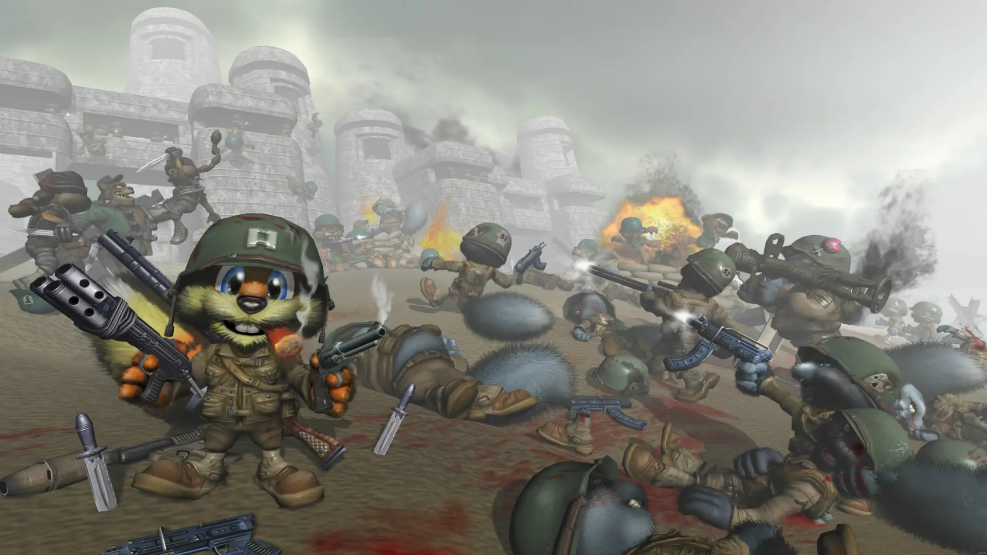 The game features intense Deathmatch and Campaign story line modes via Xbox Live and System Link, and players can compete as one of six combat specialists across multi-mission campaigns covering Old War and Future War. The warfare promises to deliver the non-stop action, humor, and innuendos Conker is famous for.