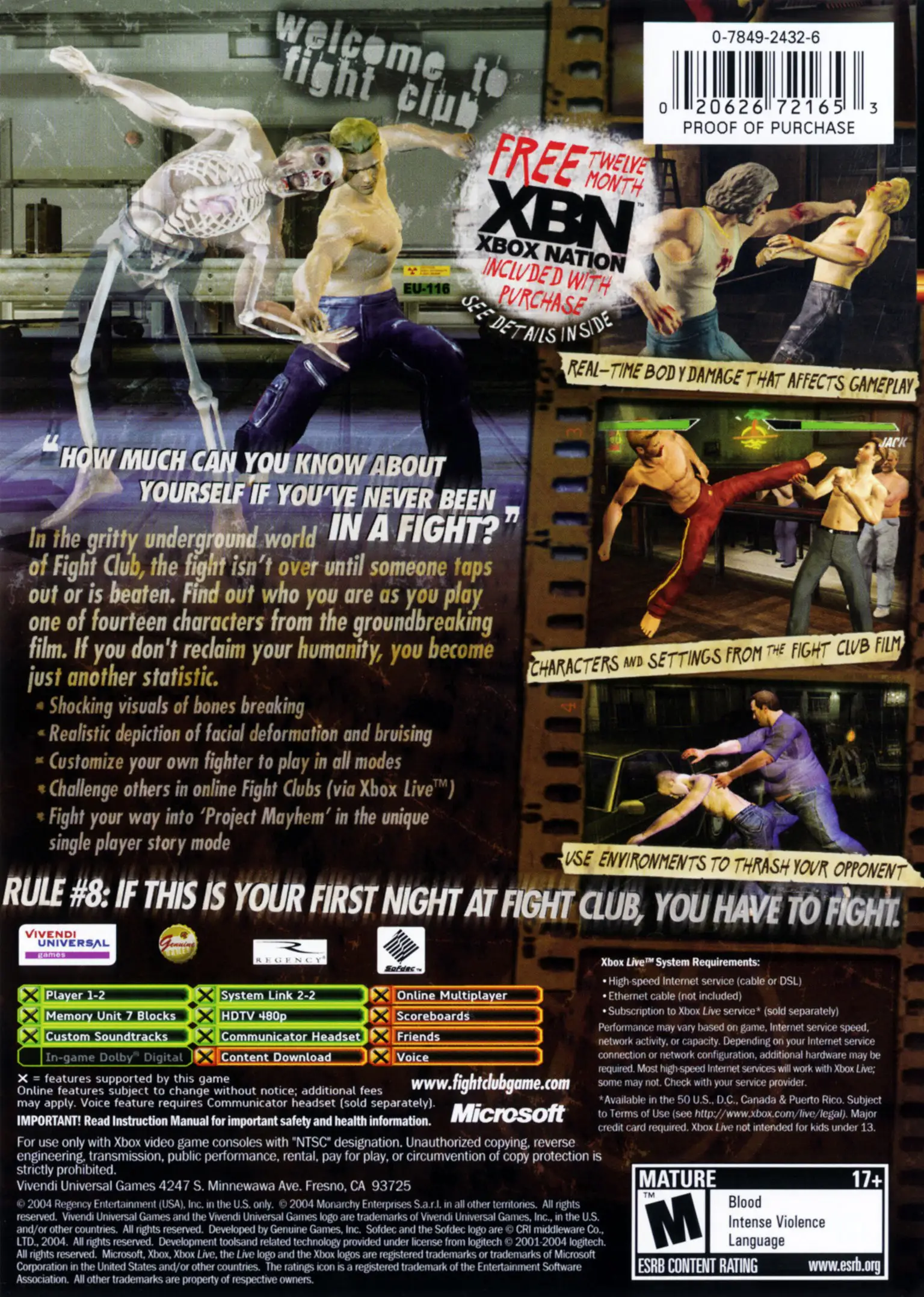 Fight Club is based on David Fincher’s film adaption of Chuck Palahniuk’s novel of the same name. Fed up with consumerist American culture, a fight club is founded as a new type of therapy through bare-knuckle fighting. The game focuses on the fights and uses many characters and environments from the original story. You can create a new fighter or clone one of the generated characters. There are three general fighting styles to choose from: grappling, kung fu or brawling. The moves range from basic punches to devastating moves with broken bones, ripped clothes and real-time facial deformation. After each successful fight, you earn Character Development Points (CDP’s) which can be used to upgrade or heal your character.