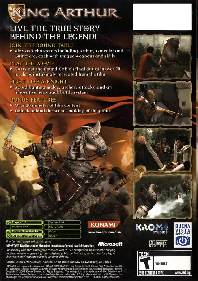 Live the true story behind the epic legend of King Arthur and the Knights of the Round Table. Based on the King Arthur movie from producer Jerry Bruckheimer, the King Arthur game lets you take control of one of five heroes, including Arthur, Lancelot, and Guinevere, each with unique weapons and skills. With three modes of battle, motion-captured fighting sequences and moves, and cutscenes from the film, King Arthur re-creates the events of this legendary tale.