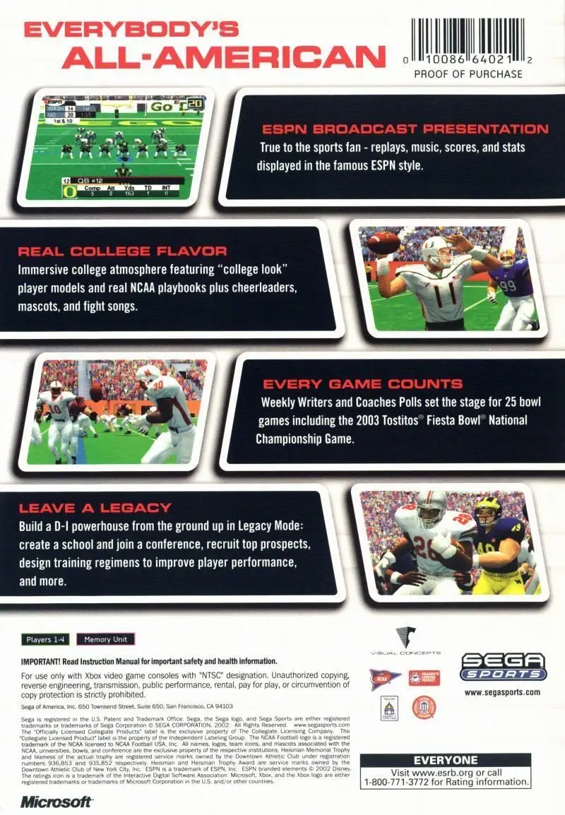 It's time to hit the turf and get ready for another round of NCAA football action. NCAA College Football 2k3 is here and it's full of updated rosters, teams and stadiums to fulfill all of your college football needs. Play as your favourite up-and-comers with a friend to see who's the best. NCAA College Football 2k3 is here for the Microsoft Xbox and it's go time. Hut, hut!