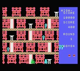 You are a man who must collect a set of keys on a level with several floors. You can jump between floors using springboards, which gives you an advantage over your enemies, who must use the ladders to climb between floors. You must also use those in order to descend to a lower floor, mind you. Later levels add touches such as a a ski slope which you must ascend while avoiding the baddies. Hitting them from below will put them out of action, though.