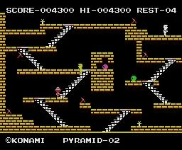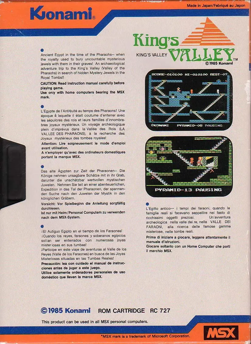 King’s Valley is a platform/maze game from Konami, released for the MSX computer and MS-DOS in 1985. The game plays is like Lode Runner except it takes place in pyramids instead of Egyptian ruins. As an intrepid adventurer, the player’s goal is to collect various gems, while evading angry mummies and other monsters long enough to find the exit to the next level.