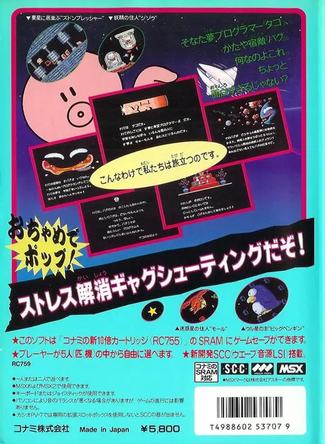 The player can play as either Takosuke, an octopus, the Penguin (father of Pentarou) from Antarctic Adventure and the exclusive MSX game Penguin Adventure, Goemon from the Ganbare Goemon series, the Popolon knight from the MSX game Knightmare or the Vic Viper spaceship from Gradius. The game is composed of six stages consisting of various obstacles and enemies such as penguins and bees, as well as more traditional Gradius enemies such as moai. As with Gradius, the game utilizes a similar selection-bar based power-up system.