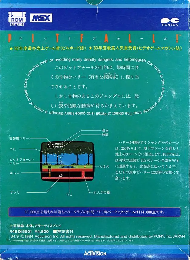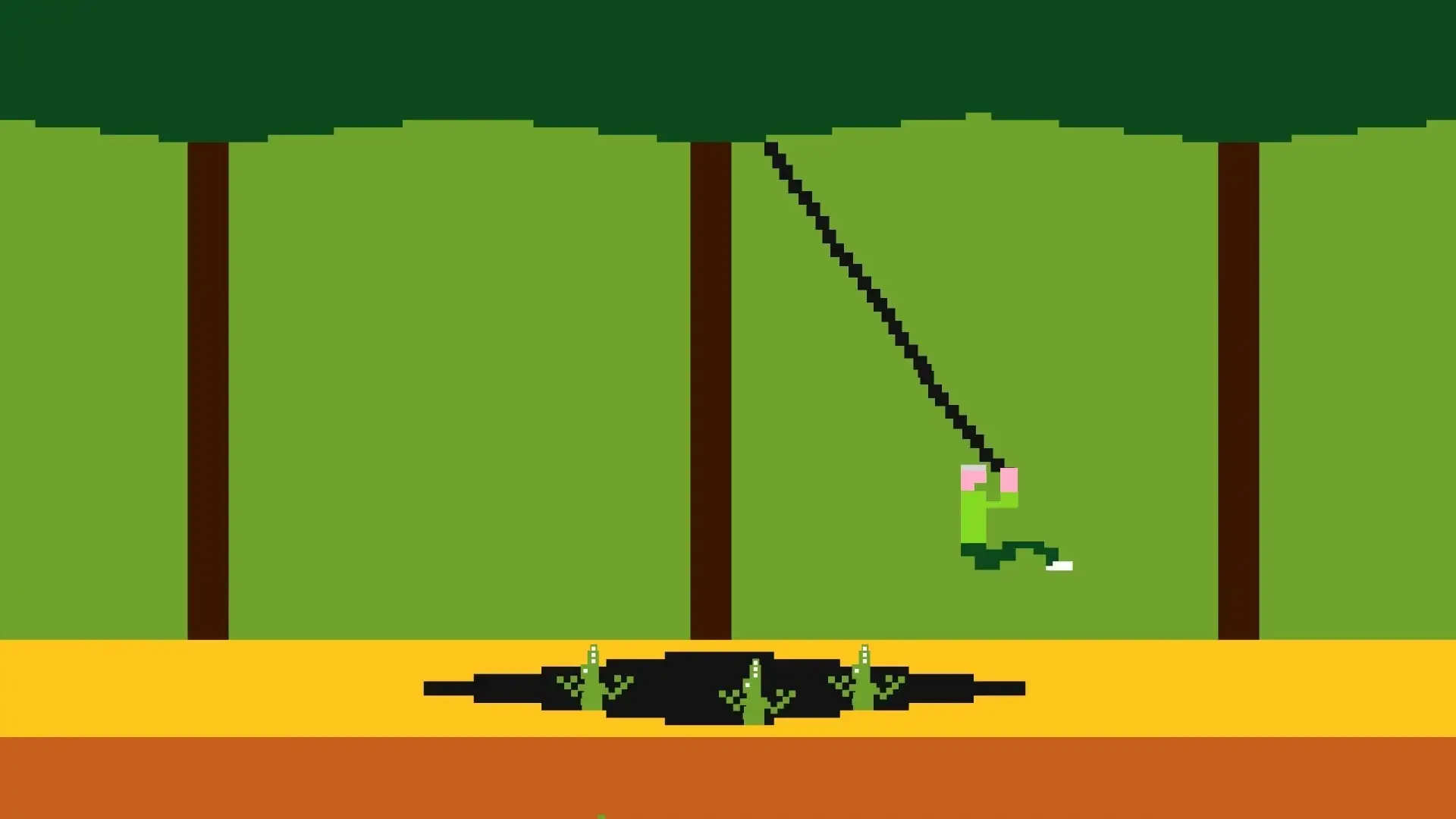 The player must maneuver a character known as Pitfall Harry through a maze-like jungle in an attempt to recover 32 treasures in a 20-minute time period. Along the way, he must negotiate numerous hazards, including pits, quicksand, rolling logs, fire, rattlesnakes, scorpions, and crocodiles. Harry may jump over or otherwise avoid these obstacles by climbing, running, or swinging on a vine to avoid them. Treasure includes gold and silver bars, diamond rings, and bags of money. Under the jungle there is a tunnel which Harry can access through ladders found at various places. This is required to get around some surface areas that have no way across otherwise. The tunnels are filled with dead-ends blocked by brick walls, forcing the player return to the surface at one of the ladders, and try to find a way around again. The tunnels also contain treasure and scorpions Harry must jump over.
