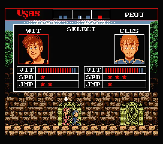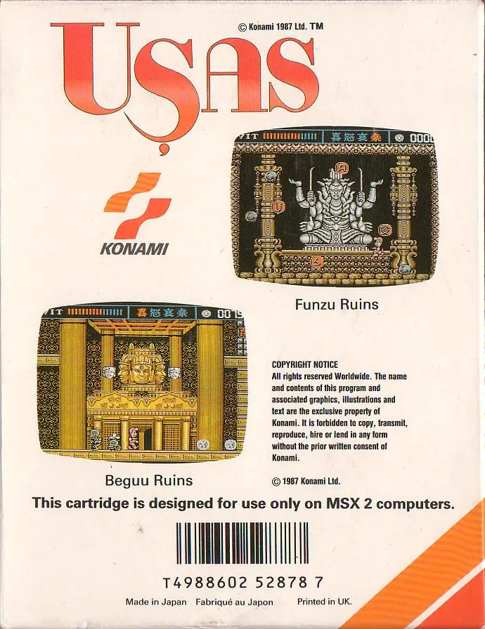 The Treasure Of Usas is a platform game. Centuries ago, the War God Induras banished Usas, the supreme Mother God, and threw the four pieces of her jewel in the winds. Wit and Cles are attempting to find the broken jewel to try and achieve one of the greatest discoveries of the academic world. Their adventures, controlled by you, will lead them to many strange places to fight many unusual enemies. There are five stages in the game.