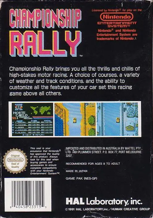 Championship Rally brings you all the thrills and chills of high-stakes motor racing! A choice of courses, a variety of weather and track conditions, and the ability to customize all the features of your car set this racing game above all others!