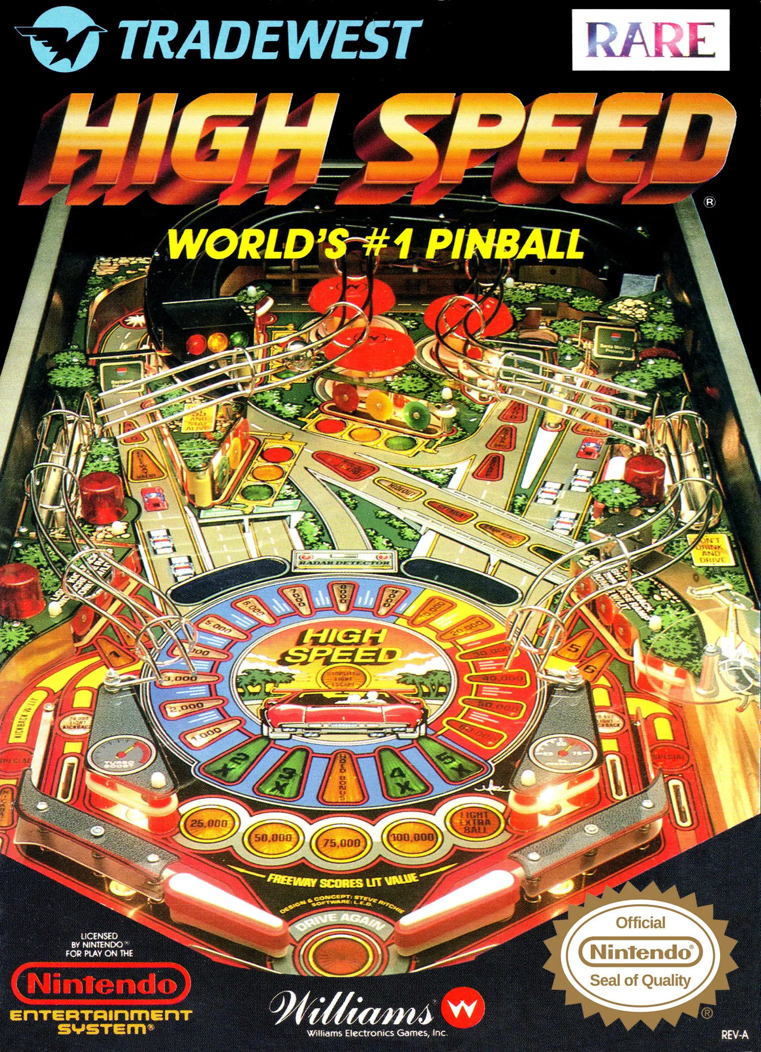 The hottest pinball game ever has been converted to video! All the action and excitement of the original HIGH SPEED is here – Freeway Frenzy, Ramp Race and Running the Red – plus excellent new features like Lightning Bombs and attacking enemies! It’s a real-life adventure. The screen flashes and a siren shrieks when you run the red light! Police car radio messages and original chase music both add to the thrills. Go for the burn – grab the jackpot and get away at HIGH SPEED!