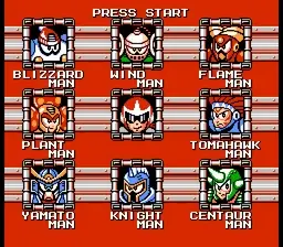 Graphics of Credits, Title Screen, Stage Select, Password Screen, and Weapon Menu Screen.