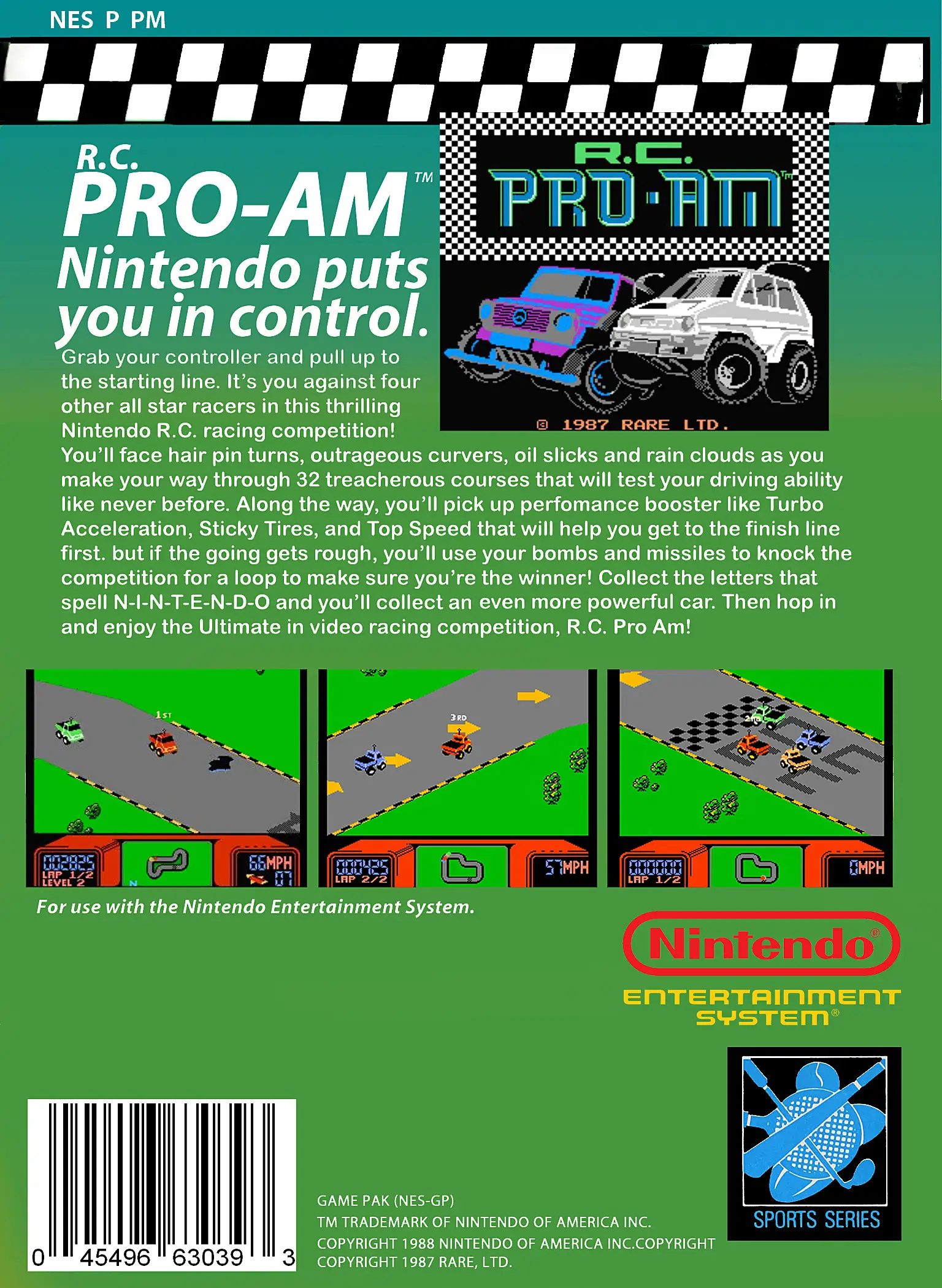 R.C. Pro-Am is a 1988 NES video game developed by Rare and released by Nintendo of America in the USA on February 10, 1988.