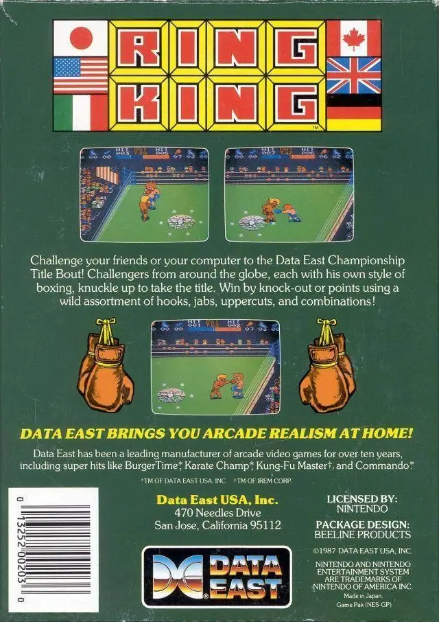 Challenge your friends or your computer to the Data East Championship Title Bout! Challengers from around the globe, each with his own style of boxing, knuckle up to take the title. Win by knock-out or points using a wild assortment of hooks, jabs, uppercuts, and combinations!