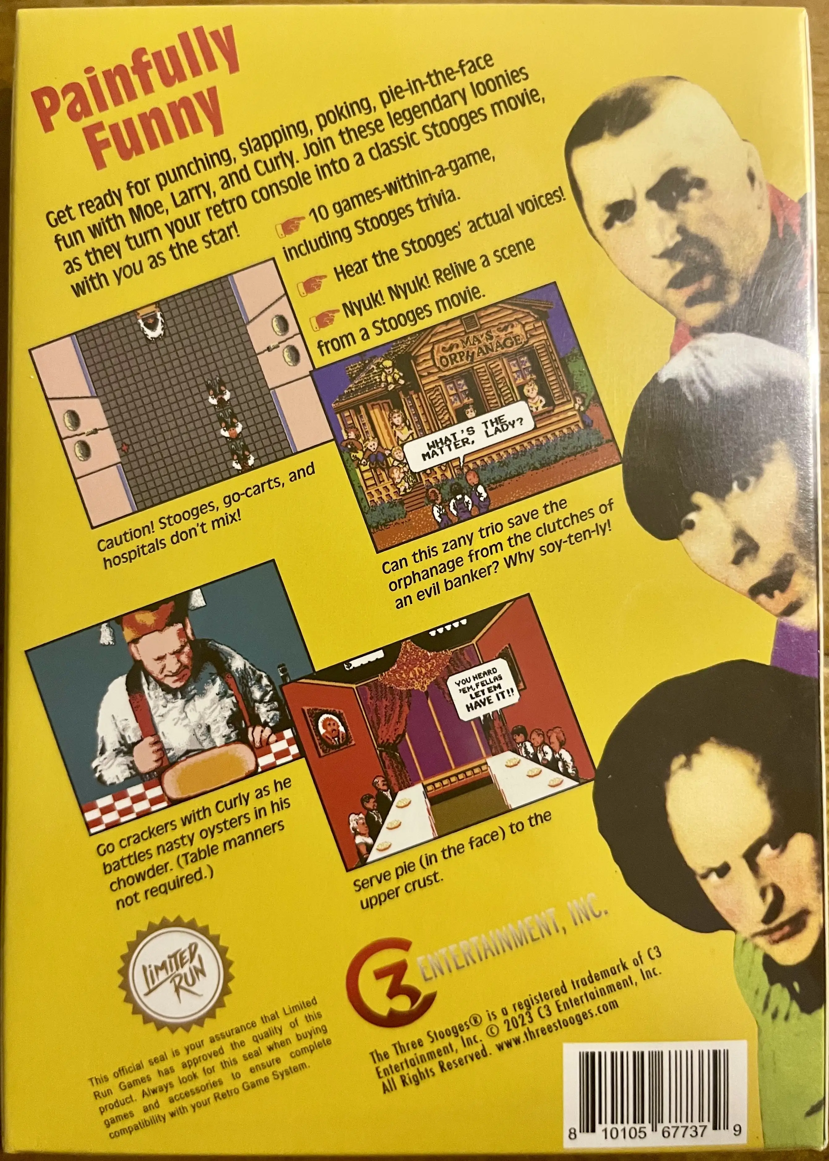 Get ready for punching, slapping, poking, pie-in-the-face fun with Moe, Larry, and Curly. Join these legendary loonies as they turn your NES into a classic Stooges movie, with you as the star!