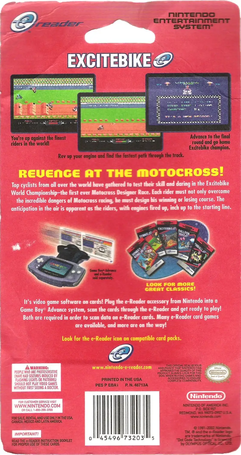 This thrilling Nintendo programmable game lets you vary the obstacles, change the sequence of events, and increase the racing challenge time and time again! You'll start out in a Nintendo designed preliminary race, and move through a series of increasingly difficult challenge races! You'll face crazy curves, hairpin turns, daredevil jumps, and some very fierce motorcross competition, as you race your bike towards the checkered flag. This thrilling test of driving strategy and skill will keep you riveted to the screen for hours!