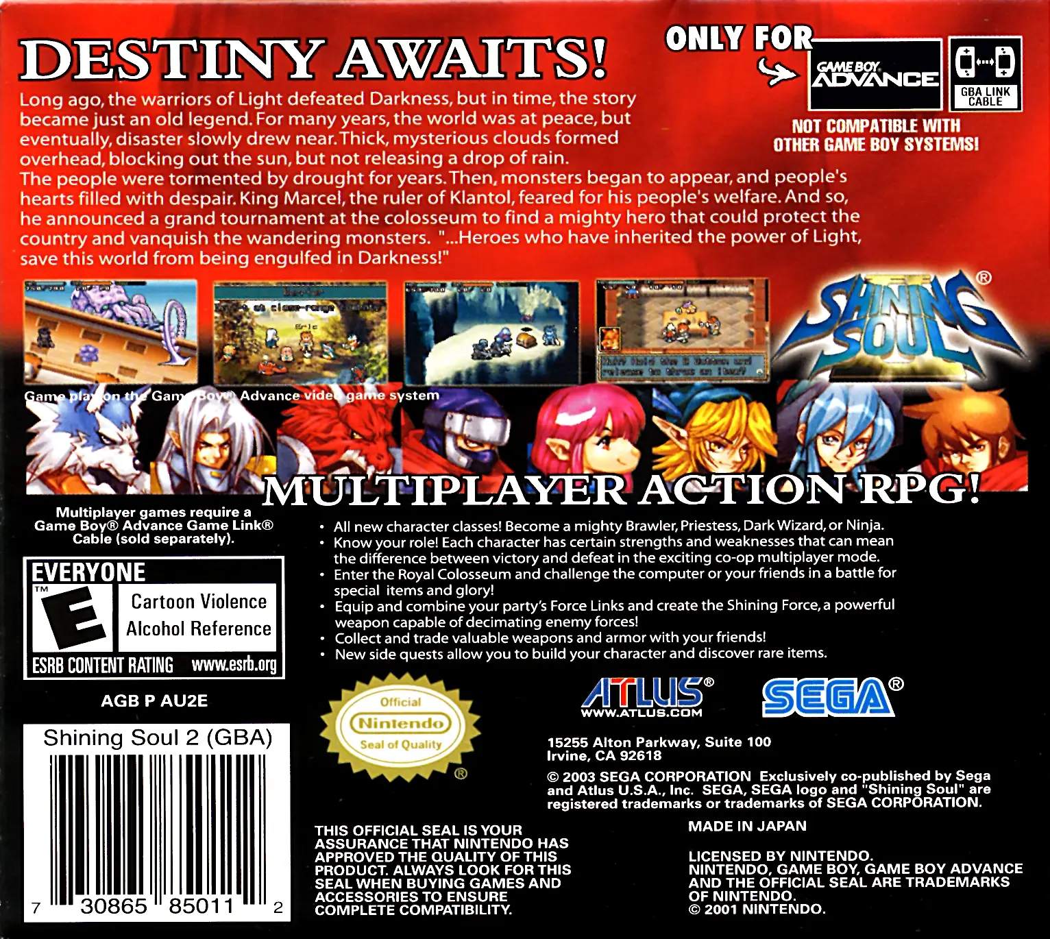 As monsters begin to appear in the kingdom Klantol, King Marcel announces a grand tournament at the coliseum to find a hero that can protect the country. Now, as a mighty Brawler, Priestess, Dark Wizard, or Ninja, you must accept the king’s challenge. Each character has certain strengths and weaknesses that can mean the difference between victory and defeat in single-player, multiplayer, or cooperative multiplayer modes. In addition to valuable weapons and armor, you can equip your party with Force Links, which, when combined, create a Shining Force–a powerful weapon capable of decimating the enemy forces.