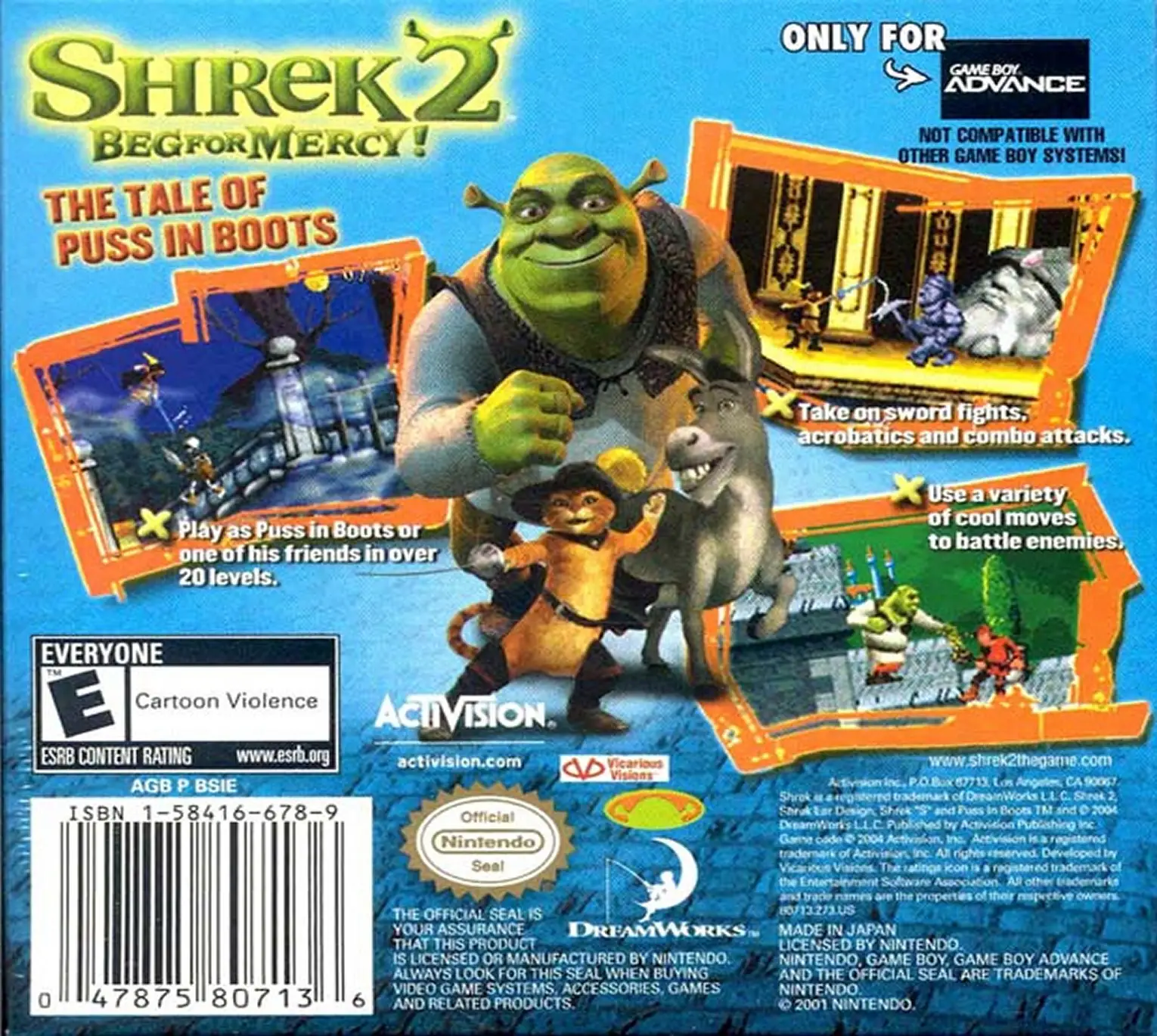 Shrek and friends are back in an all-new adventure in Shrek 2: Beg For Mercy! on Game Boy Advance. This action-oriented game features the acrobatics and swordplay of Puss in Boots. Additionally, Shrek 2: Beg for Mercy! allows players to control some of their other favourite characters, including Shrek and Donkey. Players can re-enact the story of Puss in Boots and discover just how he came to meet up with a large green ogre and a magical talking donkey. This side-scrolling adventure emphasizes combat-heavy gameplay with an intuitive input-driven combo system. Puss in Boots also has an assortment of enhanced acrobatic manoeuvres at his disposal.