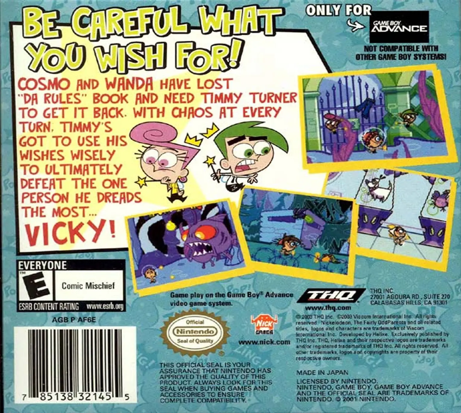 “Da Rules” book–the ultimate guide to having Fairy Godparents–has disappeared in Fairly Odd Parents: Breakin’ Da Rules, and Cosmo and Wanda are left without their magical powers. Throughout this platform adventure, you play as Timmy as he enters the comic book world, battles evil viruses, avoids boy-eating plants, and finally comes to the rescue of his Fairy Godparents. Set off on an amazing adventure to recover all the pages from “Da Rules” book and restore his Fairy Godparents’ powers.