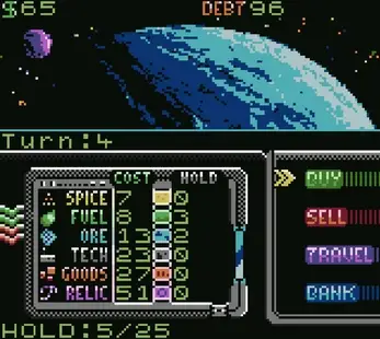 You start with a small loan and a space-worthy freight truck, you must buy low, travel, and sell high, and avoid perils — and welcome gifts along the way. Every time you travel, a new turn starts with new pricing at a new location. Randomized events can see you robbed, gifted cargo space, or experiencing a cargo fire, and more. How much can you make before your time's up?
