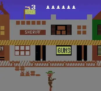 You start the game with three lives. Each life gives you a gun with 6 bullets, if you need to re-load your gun you must return to your saddle bag on your horse. The flashing arrows at the bottom left and right of the screen indicate where your next outlaw is hiding.