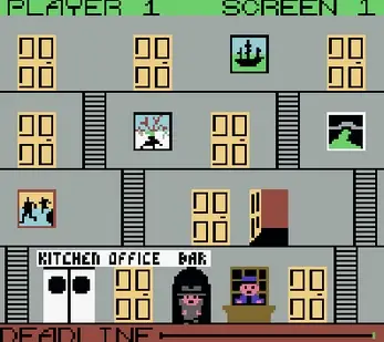 Guide Stringer, ace reporter for the 'Daily Blurb' round the hotel in search of Polly Platinum, the blonde bombshell staying there. In true street of shame style the erstwhile hack has to snoop around all the rooms looking for her. He must also find his equipment (a flash bulb) and a key for the open some door. If it wasn't enough you've got a deadline. The game has 3 difficulty levels: easy, medium, hard. At each difficulty level, 7 levels must be completed to play through the game. Meanwhile, the hotel’s staff and guests also want to catch you. There is a way for them to succeed, there is a way for us to slip past them. They look into every corner, but they can't jump between floors.
