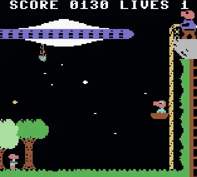 Shooting four wolves makes the way clear to leave the basket and rescue your piglet, avoiding the atomic mortar bombs dropping from the ship.