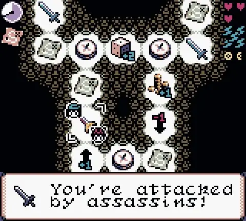 A roguelike dungeon crawler playable on the Game Boy Color. Roll dice to move across randomized sets of regions, employing whatever random selection of treasures, abilities and paths you come across to strategically push through to respite. Learn tactics, earn trophies, and push to improve your high score as you uncover what little information you can about the curse that looms over the land.