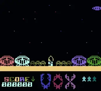 You have to defend the 4 Cities of the planet “VOX” from the alien invasion force. You must destroy the alien craft by moving a sight over the screen and firing guided missiles to sight's location. There are 3 levels. Each level consist of a set number of alien craft but an unlimited number of ammo Saucers and Stunt Planes. To complete a level you must destroy 10 alien bombs.