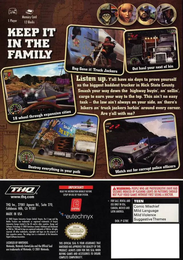 Big Mutha Truckers also known as Bakus? Convoy Densetsu in Japan is a 2002 racing video game developed by British studio Eutechnyx. Set in fictional Hick County, the game revolves around completing trips between cities, delivering goods, and competing in races while at the helm of an eighteen wheeler. The game is available on Nintendo GameCube, Nintendo DS, Xbox, PlayStation 2, Game Boy Advance and PC, but enjoyed only mediocre critical and commercial success due to repetitive gameplay, dated graphics, and lackluster sound. The game uses Steppenwolf’s “Born to Be Wild” as its theme song. The sequel is Big Mutha Truckers 2.