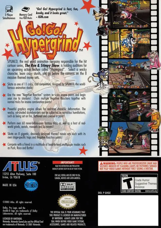 Go! Go! Hypergrind is a skateboarding video game for the Nintendo GameCube that was developed by Poponchi and published by Atlus Co. Animation studio Spümcø of Ren & Stimpy fame contributed character designs and animations to the gam