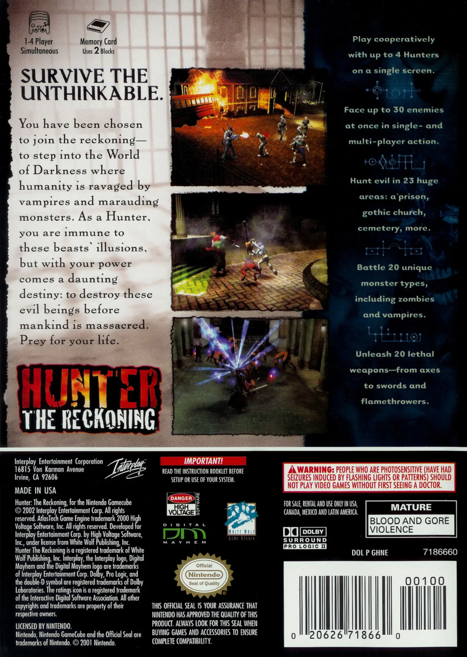 Set in White Wolf’s World of Darkness, Hunter: The Reckoning lets you take the role of one of four different hunters–Deuce, a biker ex-con; Father Cortez, a prison chaplain; Kassandra, a raver chick; and Samantha, a tough ex-cop. Armed with a variety of fearsome weaponry–ranging from axes to shotguns–you’ll battle it out with hordes of supernatural enemies. Intense action combined with multiplayer support brings the true spirit of Hunter: The Reckoning to life.