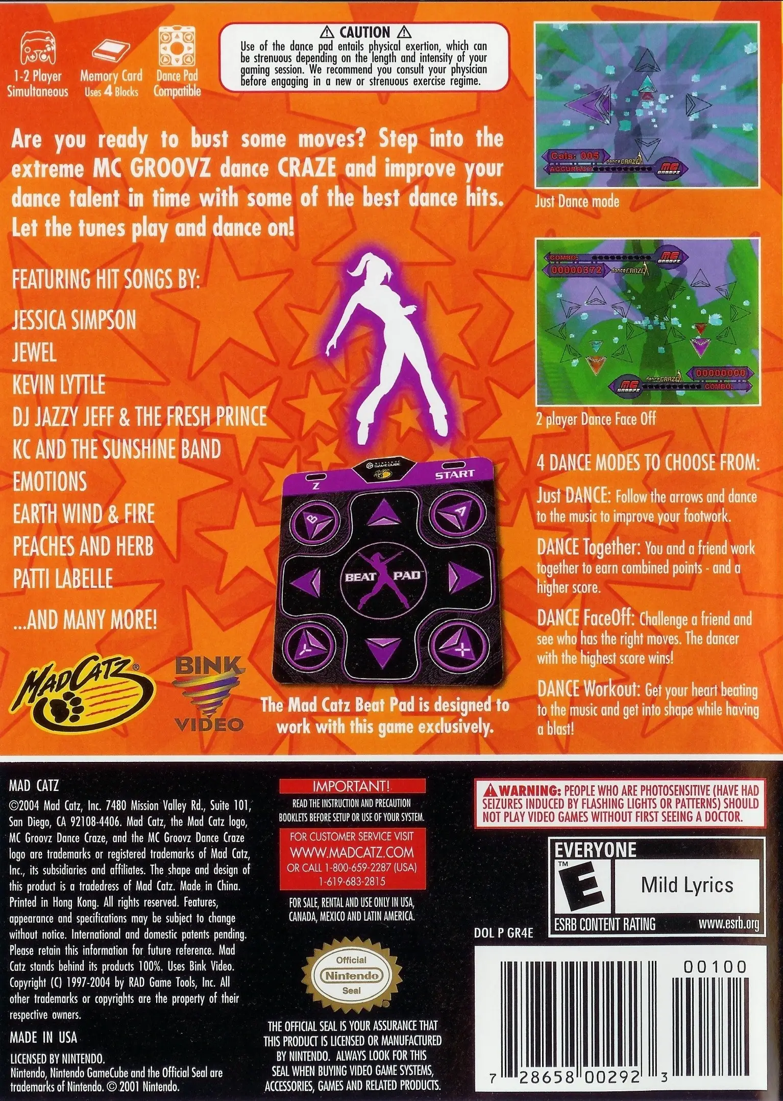 Produced by the long-time peripheral maker Mad Catz, MC Groovz Dance Craze puts players on the dance floor for songs from popular artists. Enjoy dancing to many of your favorite tunes by Jessica Simpson, Jewel, Kevin Lyttle, DJ Jazzy Jeff & the Fresh Prince, KC and the Sunshine Band… just to name a few. Groove out in single player modes or bring friends out for multiplayer modes including: Just Dance, Dance Together, Dance Face Off and Dance Work Out. You can practice to become a better dancer, show off your talent, compete against a friend, and even get dance-tastic exercise. Plus, you can still boogie down using the Nintendo GameCube Controller. The game is available with a bundled dance pad, or available separately.
