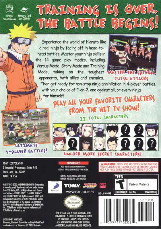 The hit series on Cartoon Network is back for more on Nintendo GameCube! NARUTO: Clash of Ninja 2 delivers non-stop ninja style combat action for 1-4 players where gamers choose to play as one of 23 playable characters. Naruto, Sasuke, Sakura and the other ninja-in training are going beyond the classroom now and must face each other and challenging new opponents in multi-ninja battles. All-new multi-player modes will engage players in frantic simultaneous four player battles and single-player modes will offer more gameplay choices than before with survival and timed attack modes that allow players to showcase their taijutsu and special jutsu abilities. When you're a ninja, you must be prepared for anything! Believe it!