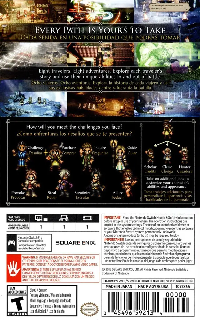 Eight travelers. Eight adventures. Eight roles to play in a new world brought to life by Square Enix. Explore each traveler's story and use their abilities in and out of battle. Will you expand your horizons as the Merchant or track down a traitor as the Warrior? Where will you go? Who will join you? You alone can choose your path. Step into the shoes of a traveler to inherit their struggles and strengths. Use each character's special abilities to interact with the world and enhance your tactics in turn-based battles. The Dancer's alluring charm leads followers into battle, whereas the Apothecary can mix items to heal allies or unleash explosive attacks. Discover enemy weaknesses and target them to break through their defenses. Sore Boost Points each turn and spend them at strategic times to strengthn abilities, chain attacks, or provide aid. Choose the path you wish to walk and discover what lies beyond the horizon.
