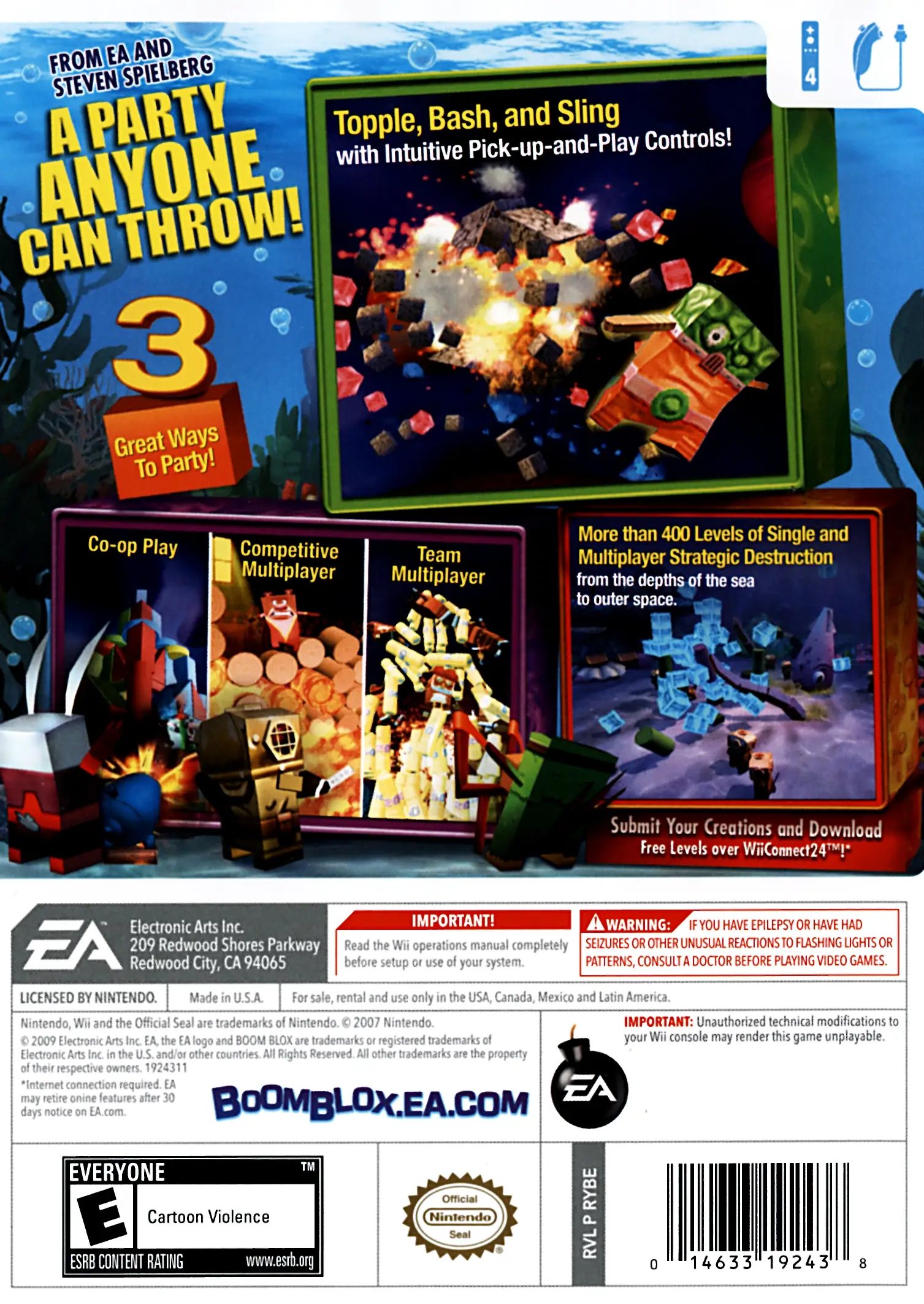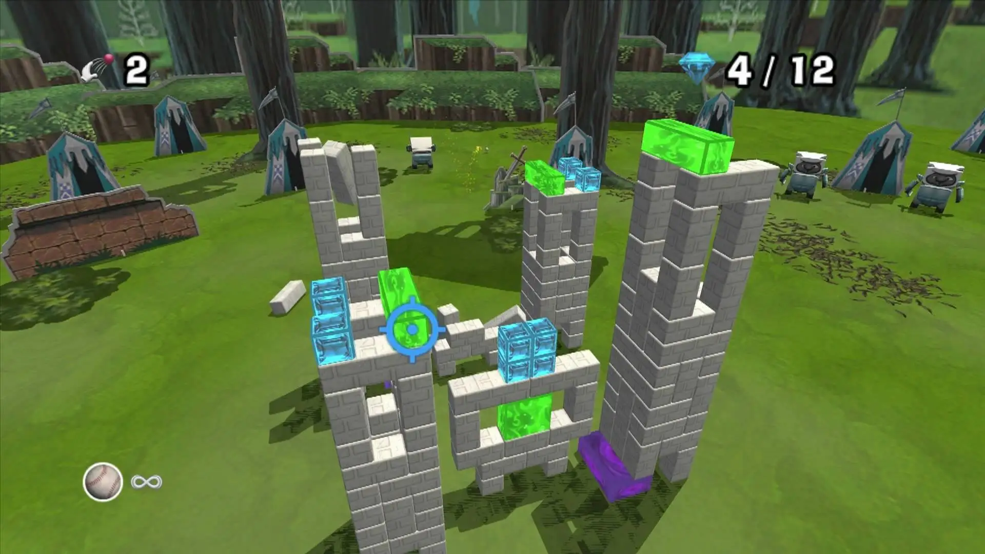 Like the original BOOM BLOX game Bash Party is based around fast-paced gameplay that utilizes players’ reflexes, dexterity, and problem-solving skills. During the action players use the Wii Remote to direct objects and forces toward structures made of blocks in order to knock them over. There is also Jenga like gameplay during which players pull blocks, with the goal of toppling as many of them as possible, but without bringing down the whole structure. In doing this players have to deal with the different types of blocks in play. Some of these include: gem blocks, blocks with point values attached, explosive blocks that detonate on contact, vanishing blocks that disappear when struck, wood blocks, and steel blocks. In addition, as the game progresses strategies may change, meaning that players must be flexible in order to succeed.