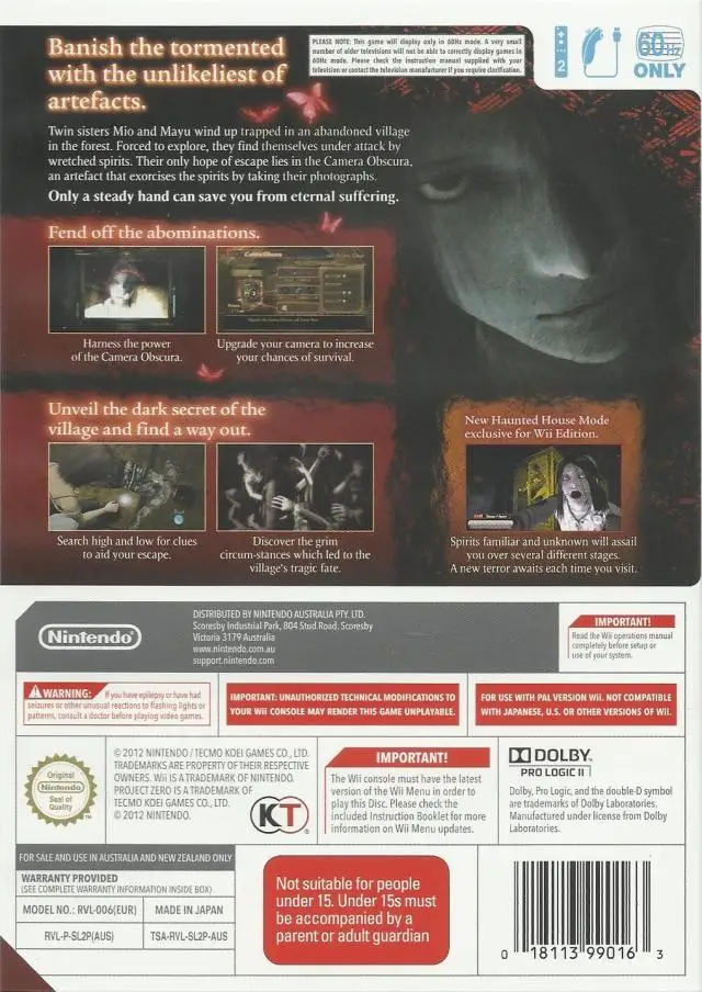 Project Zero 2: Wii Edition is an Action Adventure game, developed by Koei Tecmo Games and published by Nintendo, which was released in Australia in 2012.