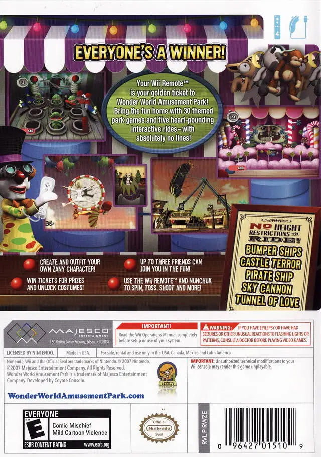 Wonder World Amusement Park includes 30 different mini-games that mirror real carnival games but are re-imagined in the park’s five stylized fantasy areas. Players immerse themselves in this fantastical world of fun by creating and customizing their own unique character with outfits and accessories purchased with mini-game winnings. As an added bonus, gamers can also enjoy playable rides within the 3D park and challenge other family members in several 4-player gameplay modes.