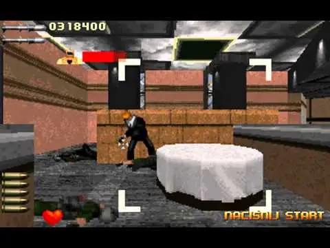 A.D Cop is a rail-shooter game, a clone of Virtua Cop. The game is all about fast aiming and features six missions, although only three are available at the beginning. Each mission is divided into three stages with a level boss at the end. The player (policeman) uses a special helmet equipped with a viewfinder computer. The computer marks the opponent in a frame defining the threat level and time remaining to attack. The player is equipped with a gun and bazooka. During the mission he can raise the weapon of the killed opponent, f.e. shotgun, grenade, M-16, automated pistol. Killing a hostage takes one life. Life can be supplemented by finding a heart symbol.