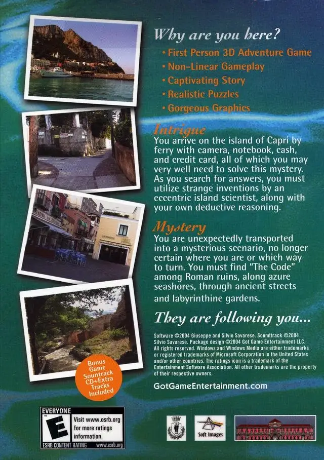 As a tourist visiting the enchanting Isle of Capri for the first time, you are unexpectedly transported into a mysterious scenario, no longer certain of where you are or which way to turn. When you regain your senses, you begin to explore the island, encountering interesting characters and intriguing clues. You wander through magical gardens, seashores, churches, monuments, villas, and old Roman ruins. To unravel this mystery, you must use strange inventions made by an eccentric island scientist, along with your own deductive reasoning.