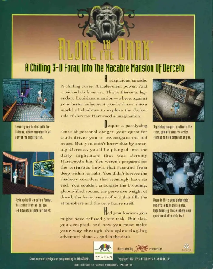 In 1924, Jeremy Hartwood, a noted artist and the owner of the Louisiana mansion Derceto, has committed suicide by hanging himself. His death appears suspicious yet seems to surprise no-one, for Derceto is widely reputed to be haunted by an evil power. The case is quickly dealt with by the police and soon forgotten by the public. The player assumes the role of either Edward Carnby – a private investigator who is sent to find a piano in the loft for an antique dealer – or Emily Hartwood, Jeremy’s niece, who is also interested in finding the piano because she believes a secret drawer in it has a note in which Jeremy explains his suicide. The player, either as Carnby or Hartwood, goes to the mansion to investigate. As the player enters the house, the doors mysteriously slam shut behind him or her. Reluctantly, he or she continues up to the attic. In that room, the action begins.