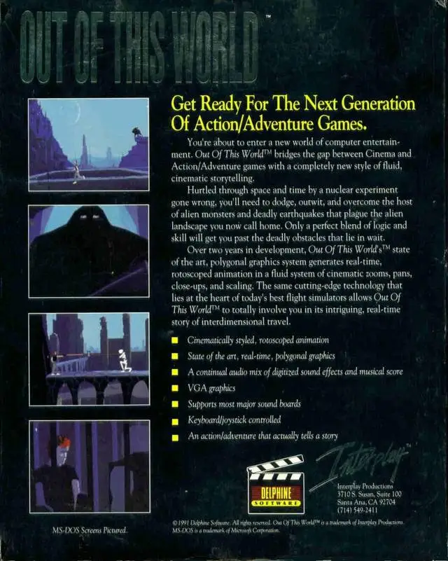 Another World (Out of This World in the US) combines shooting, platforming, and puzzle-solving elements. The game is divided into stages; some of them are straightforward and can only be accessed one time, while others are connected to each other, constituting a larger environment. Exploration and problem-solving are emphasized. Many levels include challenges not seen in the previous ones. Tasks may involve environmental puzzles, timed sequences, precise jumping, and combat.