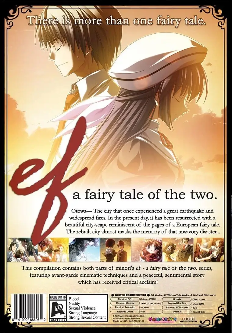 Ef: A Fairy Tale of the Two is a Japanese two-part adult visual novel series by Minori for Windows PCs. The first game in the series, Ef: The First Tale, was released on December 22, 2006, and the second game, Ef: The Latter Tale, was released on May 30, 2008. The opening video for the game was animated by Makoto Shinkai, and a majority of the music was produced by Tenmon, who has worked in the past with Shinkai and Minori. Female character design was by Naru Nanao of Da Capo fame, while male character design was by 2C Galore.