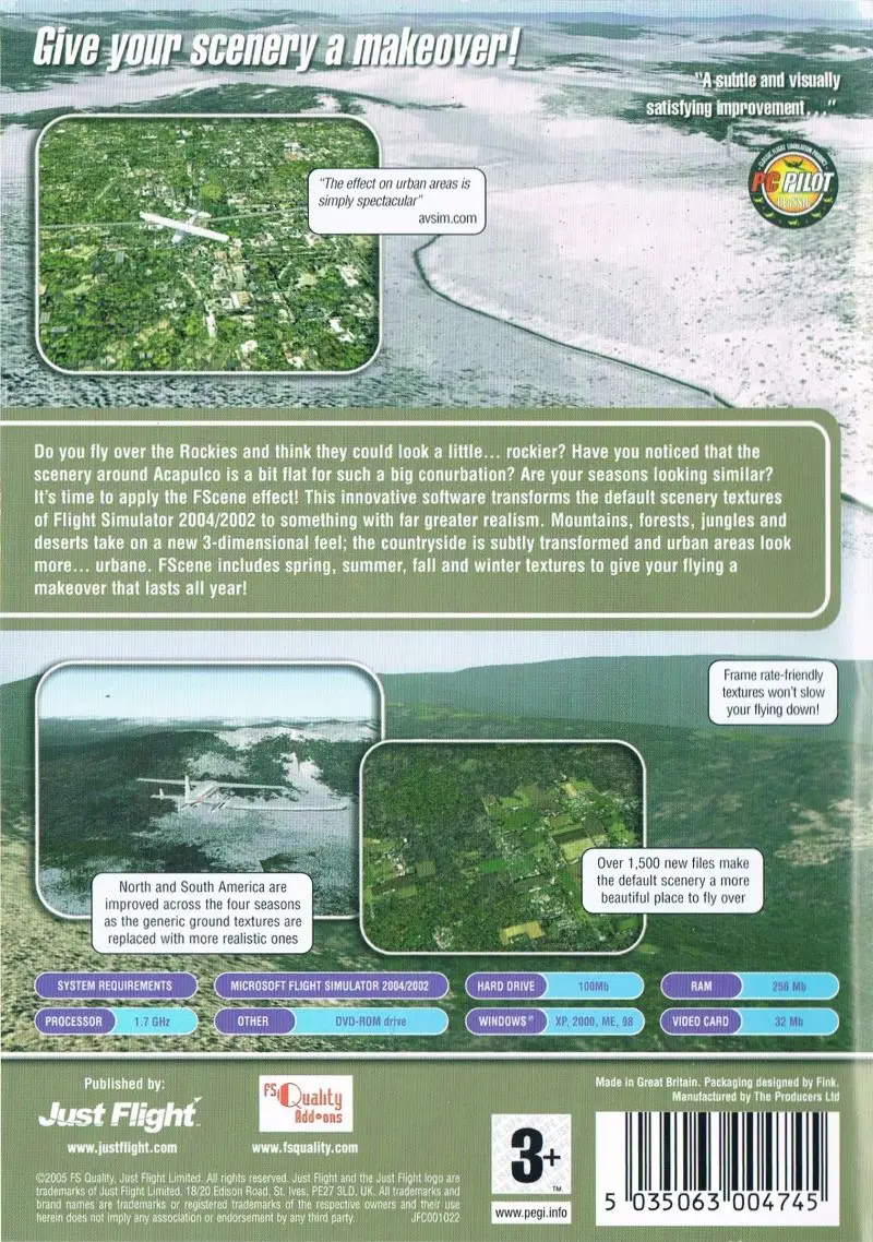 FScene Volume 2: North & South America is a scenery add-on for Microsoft Flight Simulator 2002 and Microsoft Flight Simulator 2004. This is part two of three similar packages for textures around the world. This package changes textures in the Americas. The product replaces the existing ground textures with new ones for all seasons. It will work on third party add-on meshes, but will not block photographic scenery add-ons.