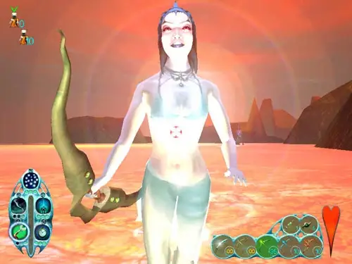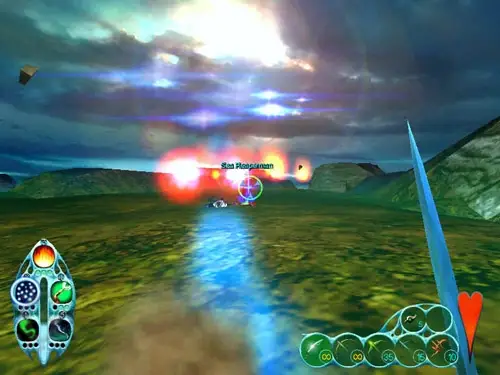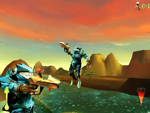 On a far away planet, three races fight for control of the few landmasses available: the marooned Meccs, who specialize in firearms and other things that go boom, the mystical and cold-blooded Reapers, who were the original inhabitants of the planet, but were forced to live in the sea by Kabuto, the third character; a truly gigantic monster with a ravenous appetite and a fondness for performing wrestling maneuvers on those the size of his hand. You can control any of these races (although in the single player mode, you have to progress through the storylines of the Meccs and Reapers first) in their bid to be the dominant species. Each species various in the way they play the game and have vastly different types of attacks available to them. Giants is a action/real-time-strategy game that emphasizes action. While there is base-building and resource management for most of the races, it is a done through a simple to control interface and one or two keystrokes. The majority of the game will be spent in a third person view (first person mode is available) jet-packing/warping/leaping about the well rendered 3D landscape. Single player sessions consist of missions with specific goals, such as resucing Smarties or recovering lost items. Multiplayer options include standard deathmatch, capture the Smartie (flag), the above with basebuilding as an option. Other creatures also inhabit the islands. From the meek Smarties (who are employed to build your bases or eaten as a primary source of protein, depending on your species), to the cow-like vimps to the deadly rippers, the fauna of the planet will either try to kill you or avoid being killed/eaten/captured. While not so energetic, the floral of the islands can be crushed, knocked over, or burned in careless combat (or by Kabuto not paying attention).