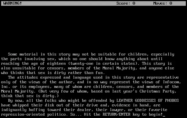 Leather Goddesses of Phobos is a text adventure with humorous overtones. The player uses standard commands in the text parser to observe his environment and pick up items. The game's 'naughtiness' level can be adjusted between Tame (G), Suggestive (PG), and Lewd (R).