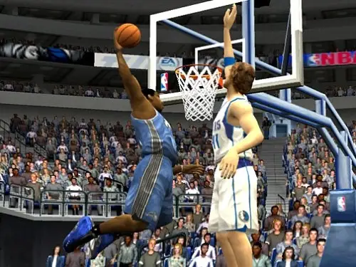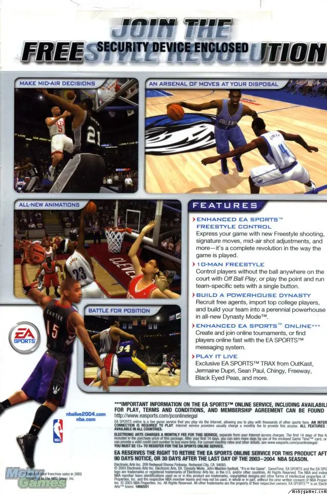 NBA Live 2004 continues EA SPORTS’ basketball series with a renewed emphasis on control within the paint and an updated graphic engine. Continuing the Freestyle Control introduced in NBA Live 2003, players can modify moves, dunks, passes, and more in real-time while driving toward the basket. Team sets like the pick-and-roll or triangle can be switched at the press of a button, and the defense has been addressed to make it as crucial a part of the game as the offense. New computer AI, animations, and rebounding controls are designed to help balance out the gameplay on both sides of the court. As in previous installments, players will be able to choose from 30 NBA teams, albeit with new 3D player models and more detailed stadiums complete with championship banners, retired jerseys, and sideline activity.