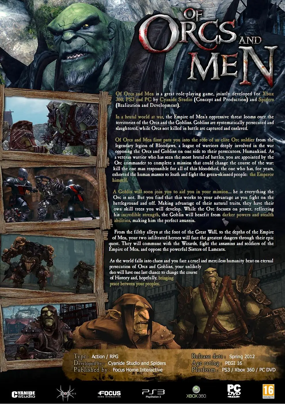 Of Orcs and Men is a fantasy action role-playing game developed by Cyanide and Spiders for PlayStation 3, Xbox 360 and PC.[2] The Empire of Men’s oppressive threat looms over the territories of the Orcs and the Goblins. Goblins are systematically persecuted and slaughtered, while Orcs not killed in battle are captured and enslaved or killed.