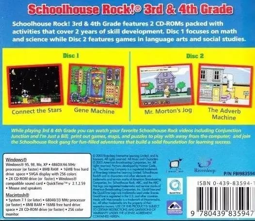 Schoolhouse Rock!: 3rd & 4th Grade is an educational game that teaches elements of the US curriculum for 3rd and 4th graders aged eight to ten. It is based on the Schoolhouse Rock! TV series. It comes on two discs and contains over 70 activities for the areas math, grammar, language arts, geography, science, and history. The game re-uses the plot of earlier games. The first disc features Interplanet Janet and the story from Schoolhouse Rock!: Exploration Station with eight areas based around math and science. Concepts include patterns and sequencing, equations, the human body, electricity, and more. The second disk is based around Lucky Seven Sampson with the plot from Schoolhouse Rock!: Math Rock. There the activities focus on language arts, geography and American history. Almost all of those were previously used in Schoolhouse Rock!: America Rock. The second disc then ends with the board game traditional for the series leading to rock star fame for Lucky.