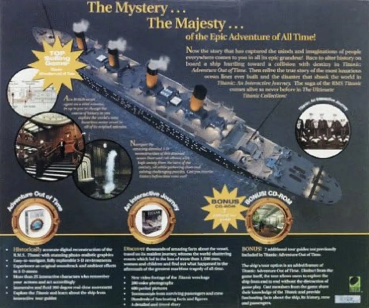 Compilation that includes: Titanic: Adventure Out of Time Titanic: An Interactive Journey Bonus CD with 7 additional tour guides not previously included in Titanic: Adventure Out of Time