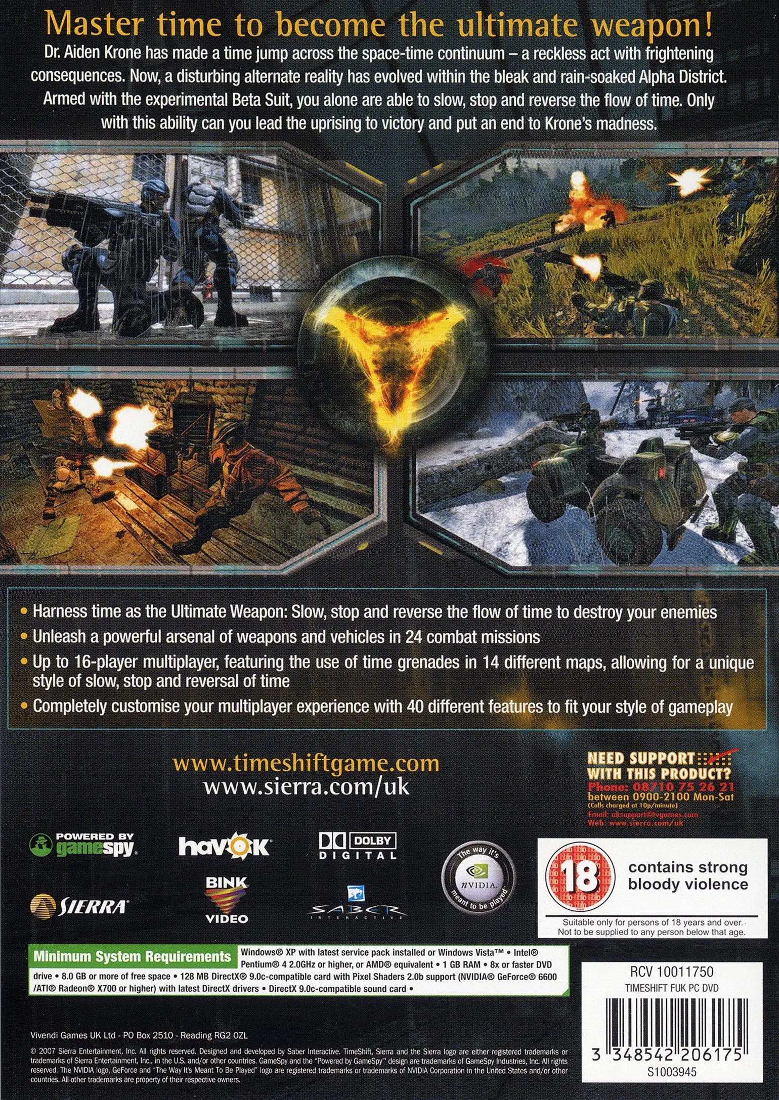 The key feature of TimeShift is the player’s ability to control time: slowing, stopping or even rewinding time more or less at will. This allows a player to stop time to dodge an incoming projectile or steal an enemy’s weapon. Specific time-related puzzles also require these abilities. The player’s abilities also affect the color of their environment in such that slowing time produces a blueshift, rewinding it produces a yellow haze, and stopping time creates a white filter “haze”. The player must use them wisely to make its way through the game. In some parts of the game your time powers are lengthened.