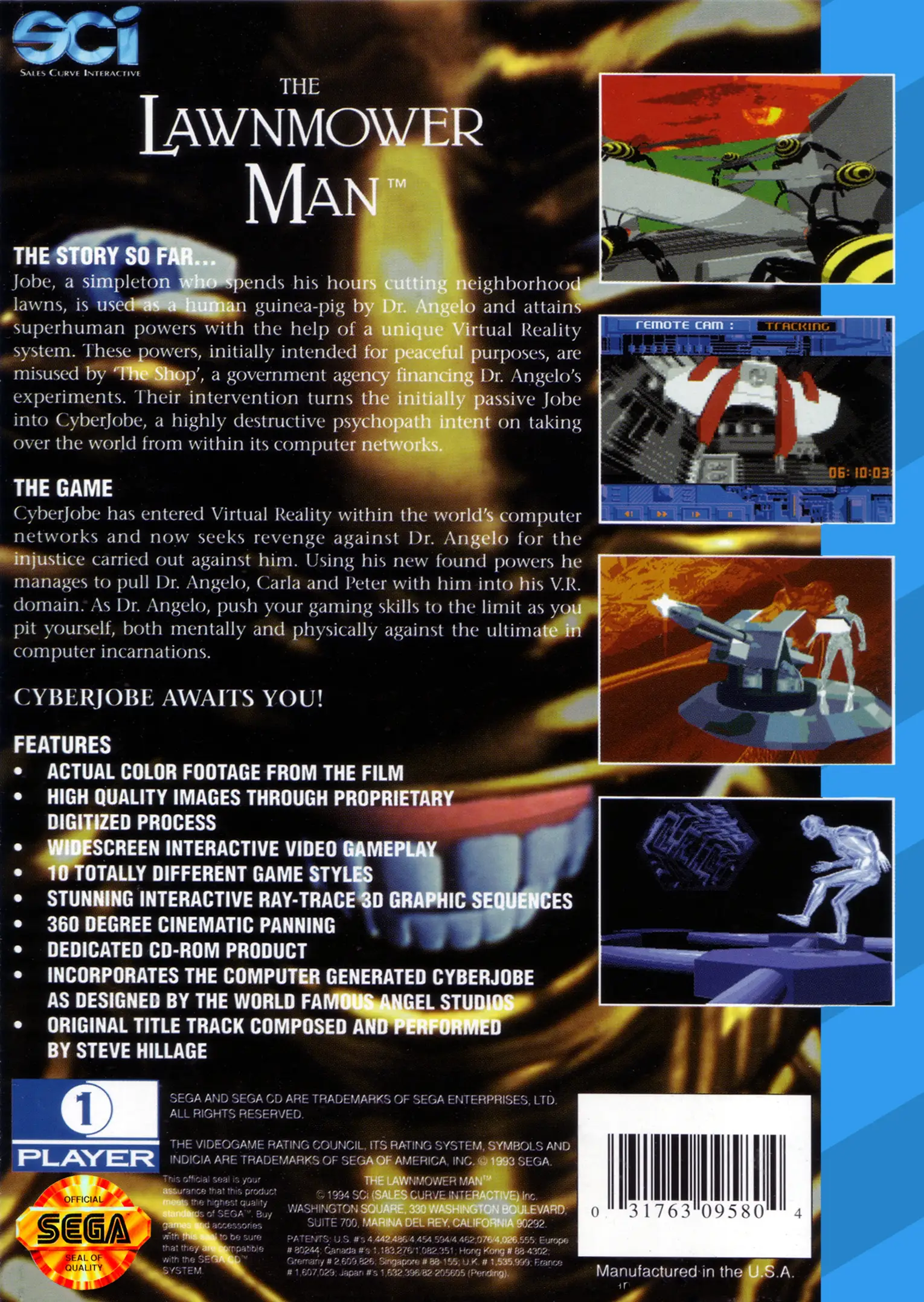 Based on the 1992 feature film, The Lawnmower Man is a collection of minigames based on the revolutionary virtual reality sequences seen in the movie. The plot parallels the central conflict – the player controls Dr. Angelo (Pierce Brosnan) as he heads into cyberspace to confront the psychotic digital god Jobe (Jeff Fahey) he has created.