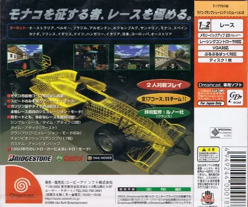 Monaco Grand Prix: Racing Simulation 2, also known as just Monaco Grand Prix, is a Formula one racing game for Microsoft Windows, Nintendo 64, PlayStation, and Dreamcast. It was released in 1998-1999. The game is based on the Formula One World Championship, but does not have the licence to use drivers names, official cars, etc. (the licence was held by Video System at the time, who made F-1 World Grand Prix and F-1 World Grand Prix II). The game does however have a licence to use Formula One's official sponsors; Schweppes and Castrol among others, helping add to the authenticity of the game. The game is unrelated to Sega's Monaco GP series.