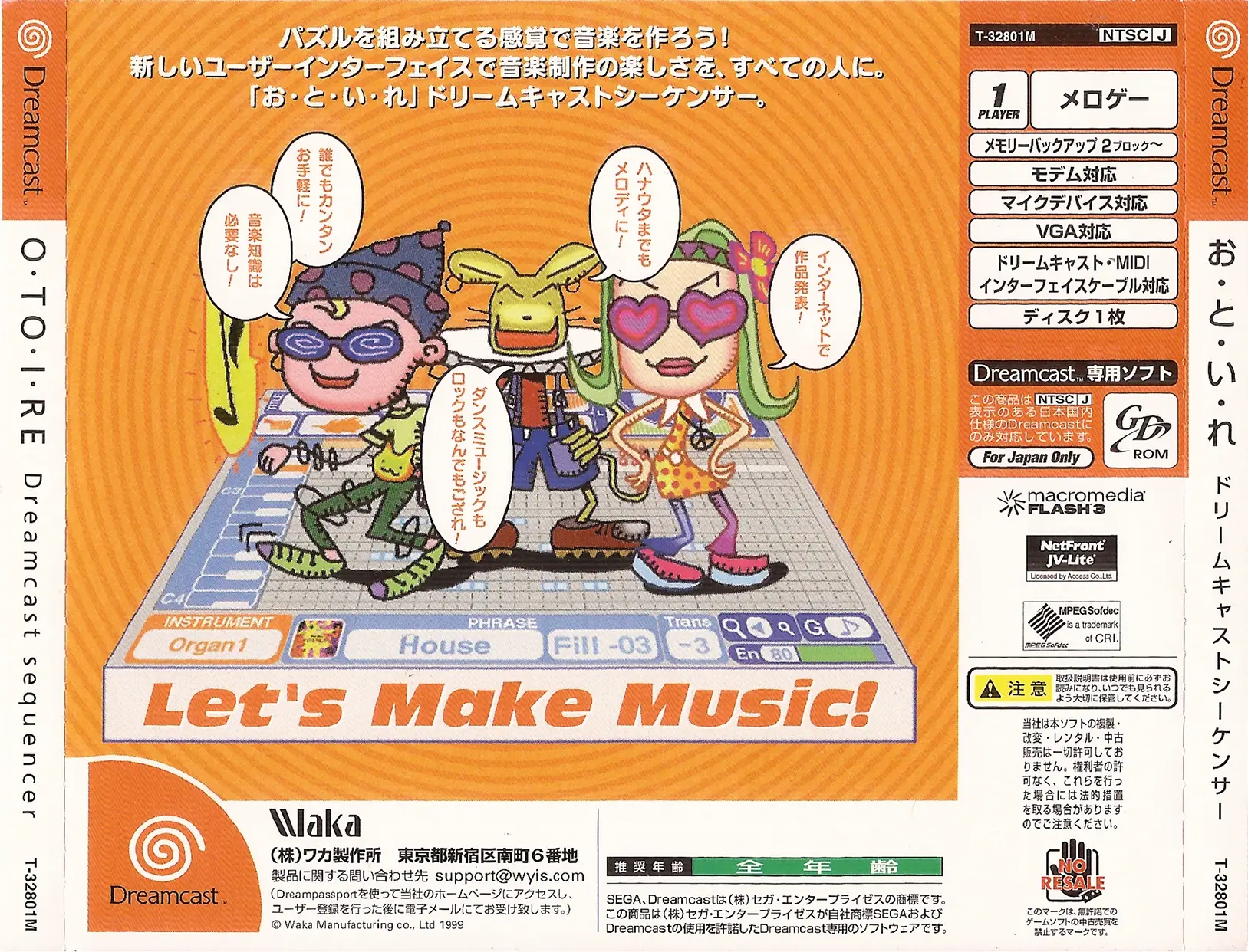 O.to.i.Re: Dreamcast Sequencer (お・と・い・れ ドリームキャストシーケンサー) is a Japan-exclusive Sega Dreamcast music creation tool by Waka Manufacturing. It was released only in Japan, and allows the player/user to produce his or her own music tracks via the Dreamcast Controller, Dreamcast Microphone, or Dreamcast MIDI Interface Cable.